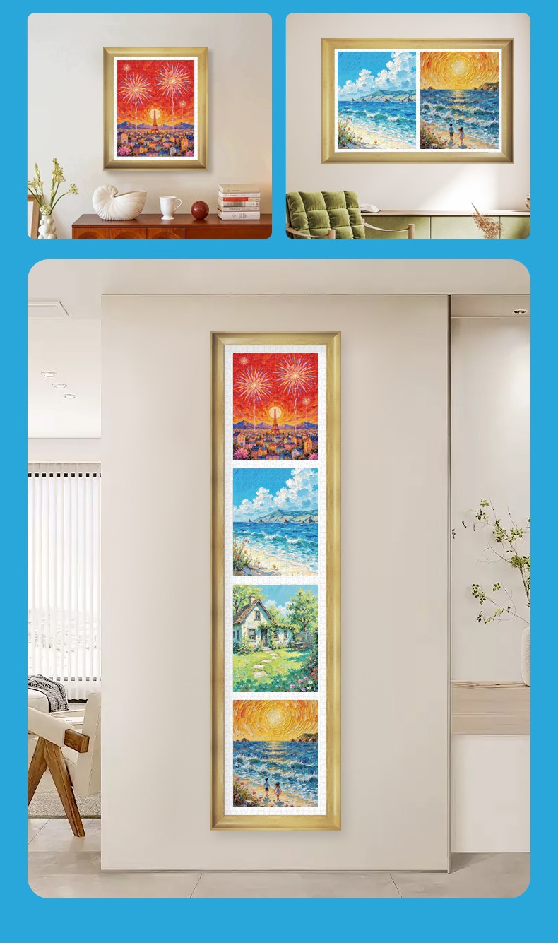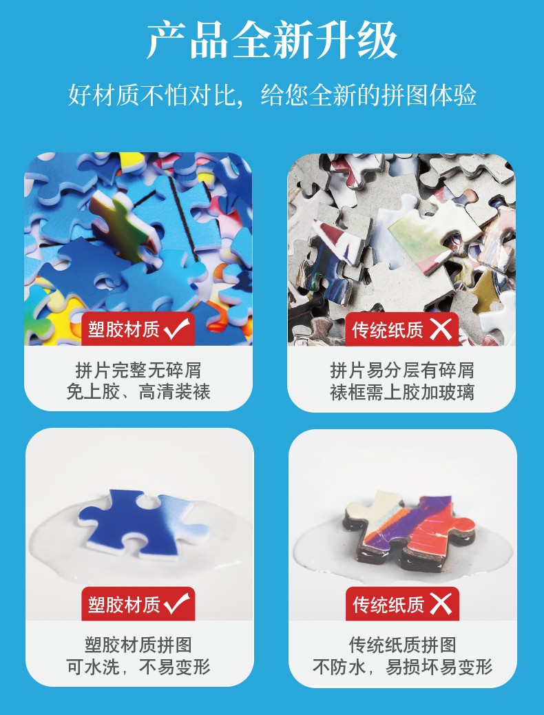 拼圖名稱:四合一塑料平面油畫拼圖 材質:塑料 拼圖尺寸:317*260mm 拼圖片數:1000片 加工方式:廠規、來圖定制 單盒包裝尺寸:185*110*48mm 四合一系列套裝:205*185*110mm