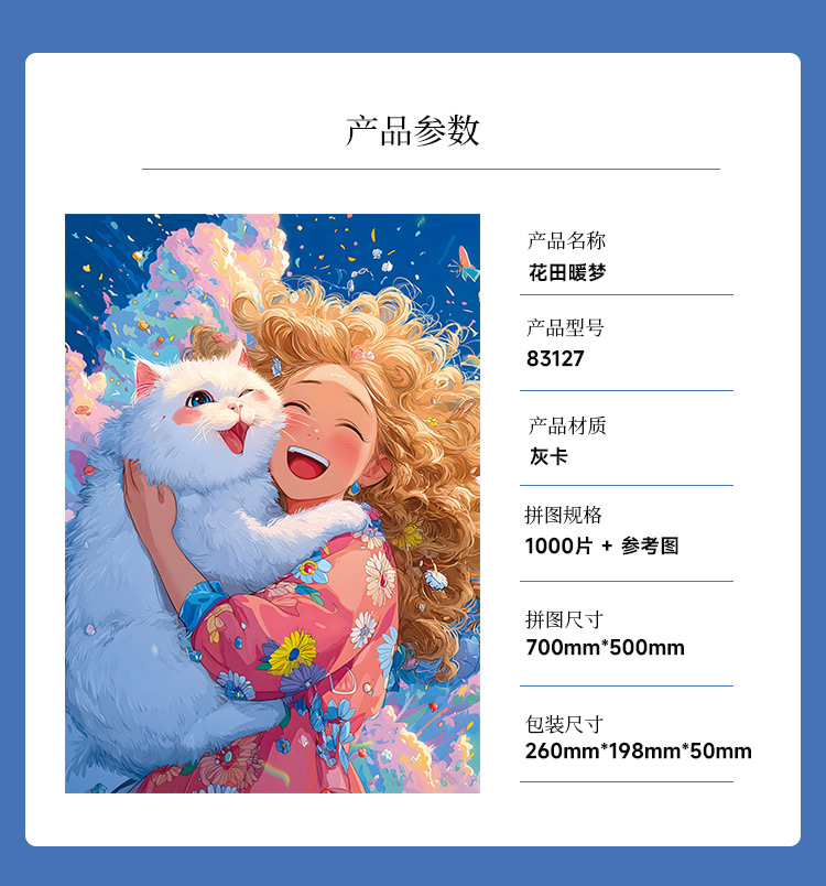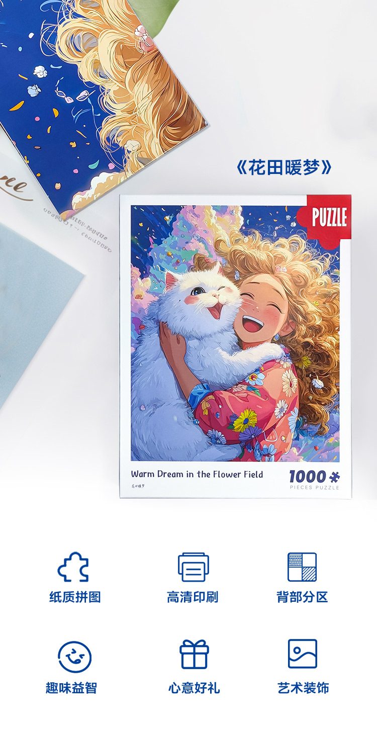 拼圖名稱:花田暖夢-83127 拼圖尺寸:700*500MM 拼圖材質:紙質灰卡 拼圖片數:1000片 加工方式:廠規、來圖定制 包裝尺寸:180*130*50mm