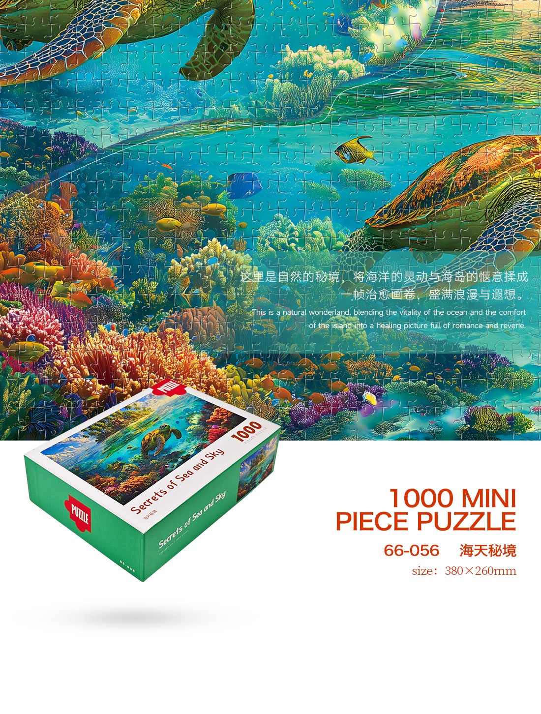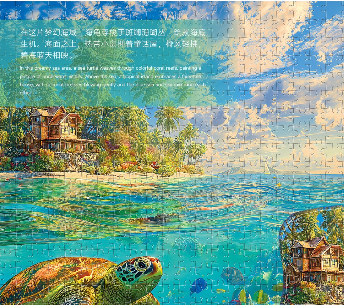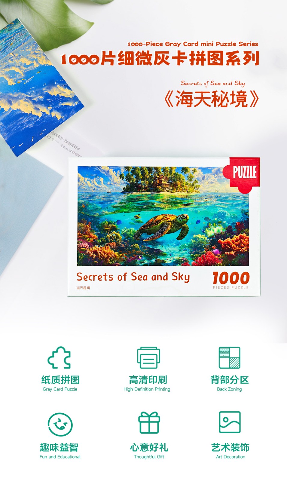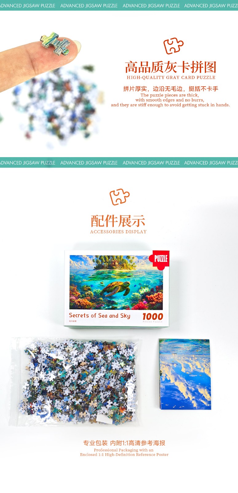 拼圖名稱:海天秘境 拼圖尺寸:380*260MM 拼圖片數:細微灰卡1000片 加工方式:廠規、來圖定制 包裝尺寸:180*130*50mm