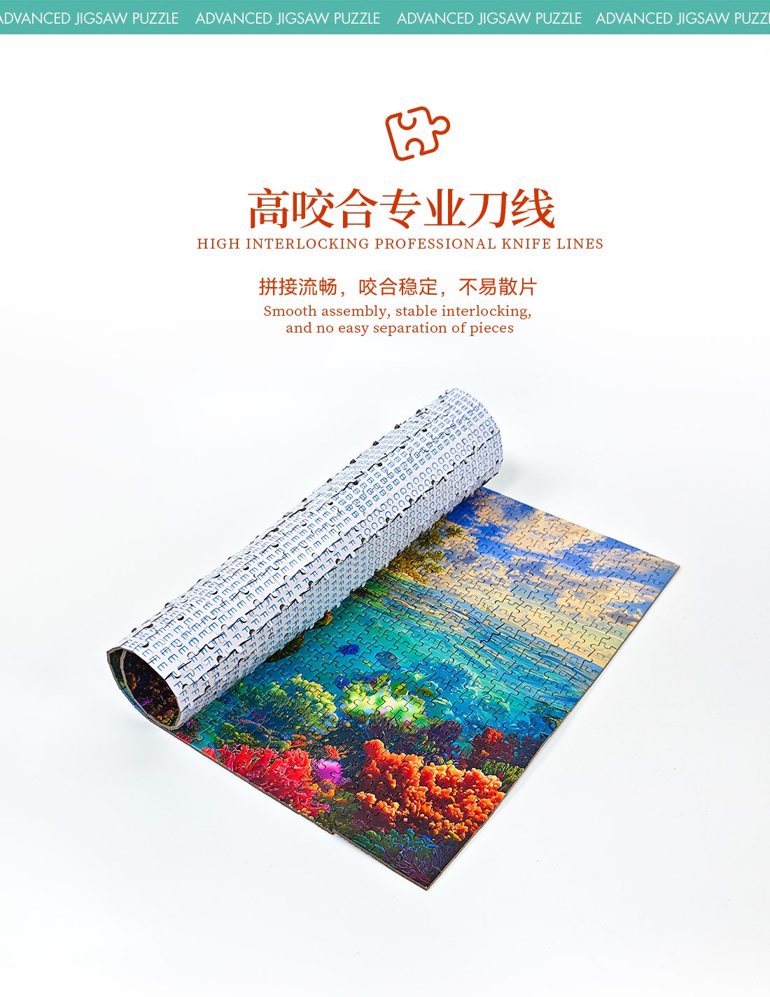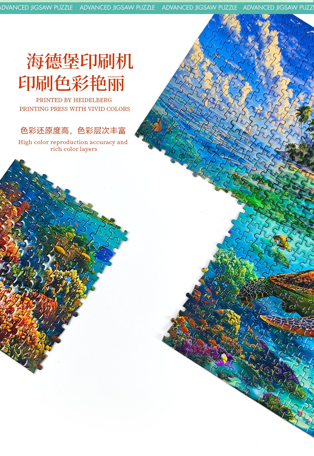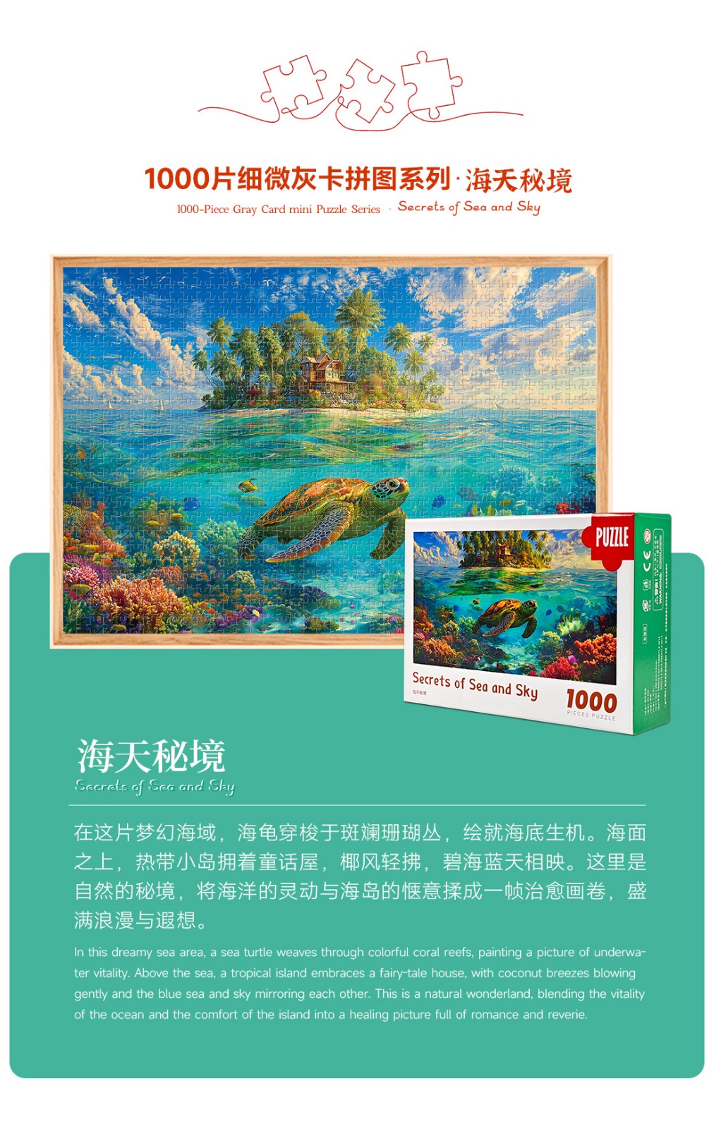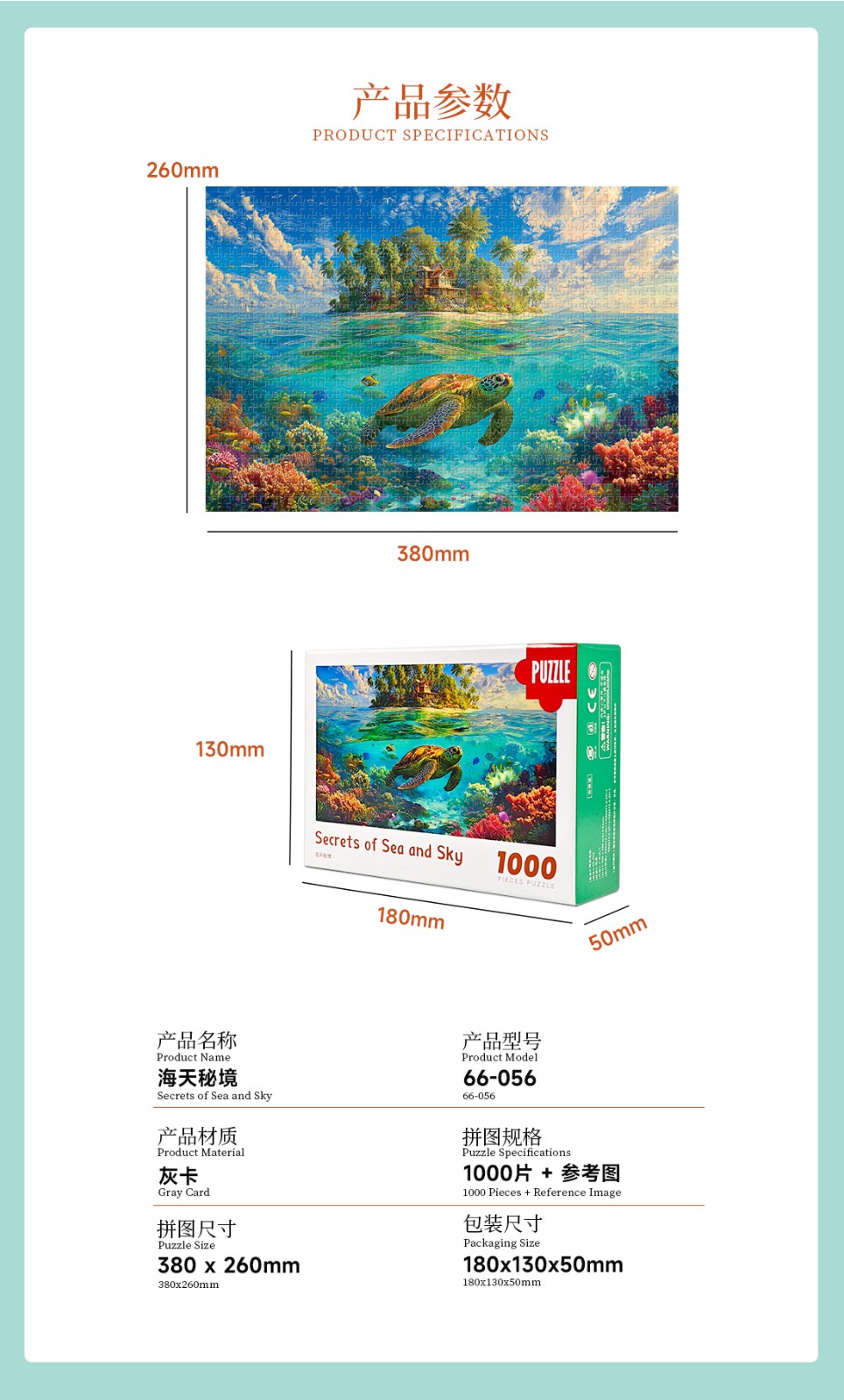 拼圖名稱:海天秘境 拼圖尺寸:380*260MM 拼圖片數:細微灰卡1000片 加工方式:廠規、來圖定制 包裝尺寸:180*130*50mm