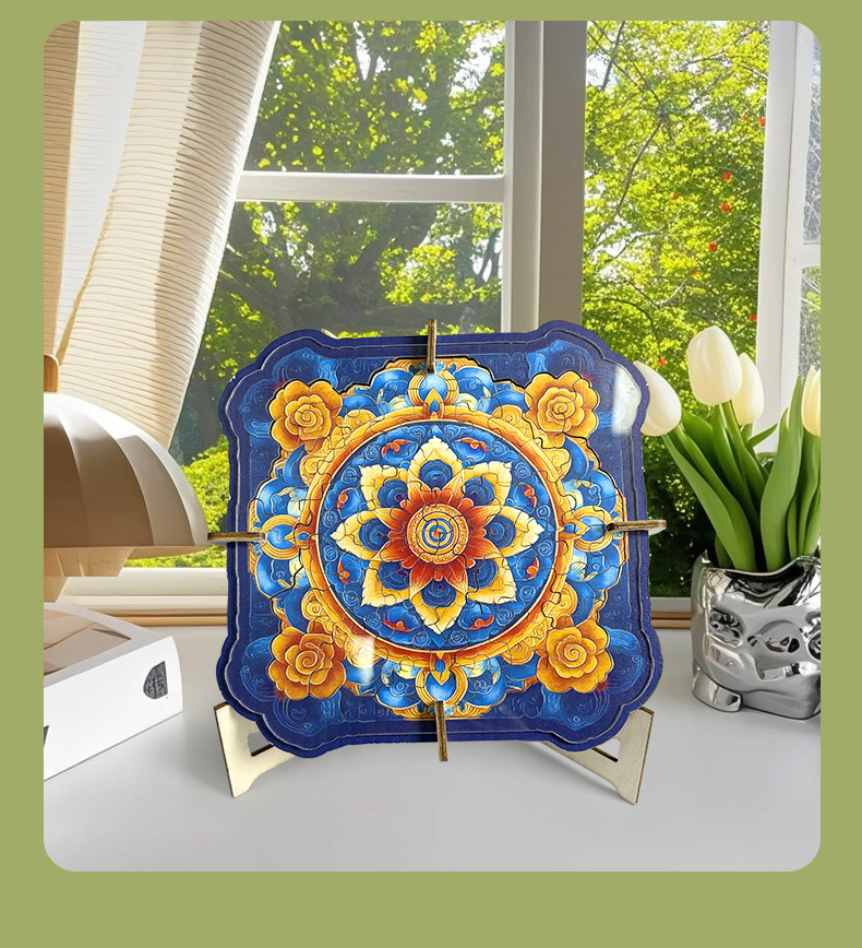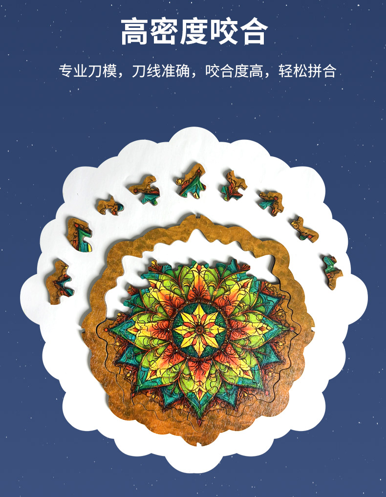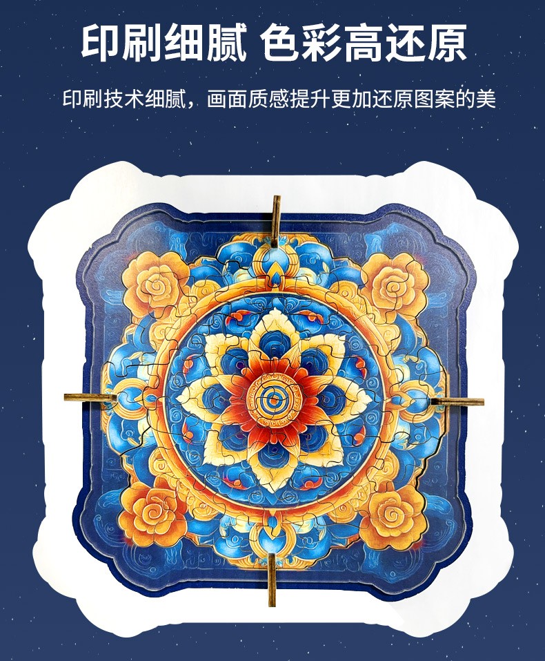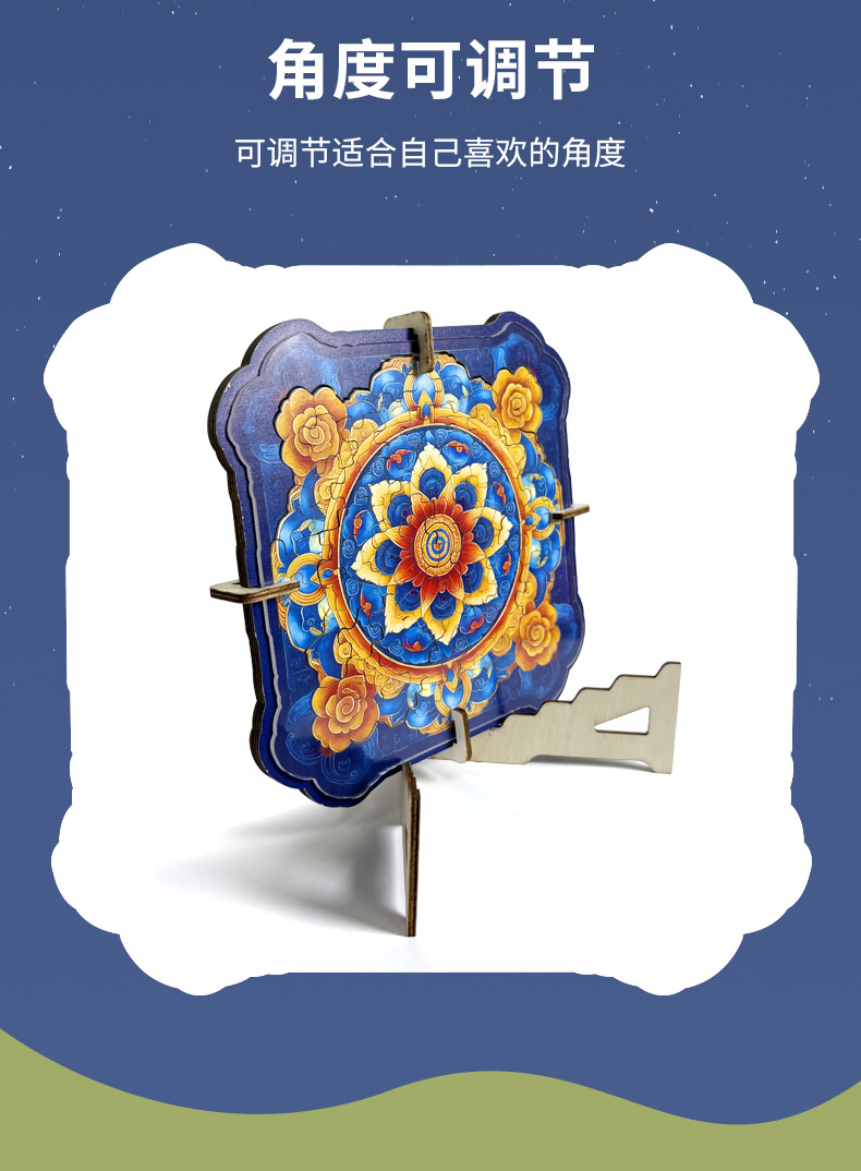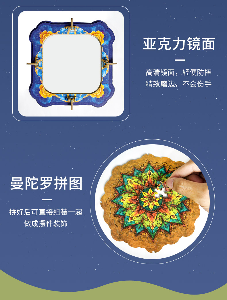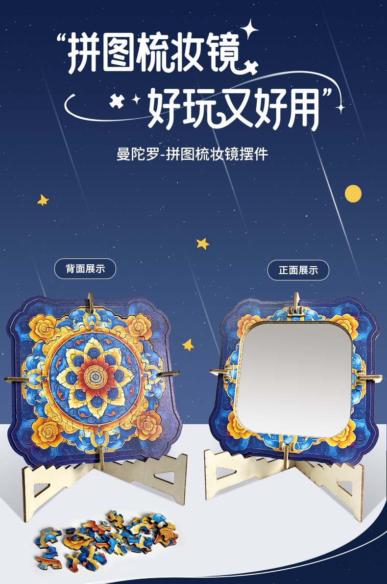 拼圖名稱:曼陀羅梳妝鏡拼圖 材質(zhì):木質(zhì) 拼圖尺寸:195*185*95mm 拼圖片數(shù):60/63片木質(zhì) 加工方式:廠規(guī)、來圖定制 包裝尺寸:190*190*40mm